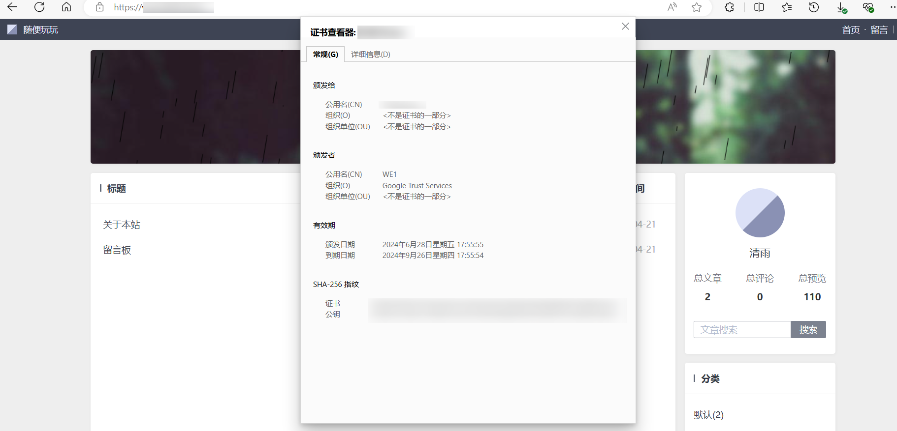 访问你的域名,不出意外的话应该能正常访问,并且会显示绿色的小锁图标。证书是Cloudflare提供的,不用担心续期问题。