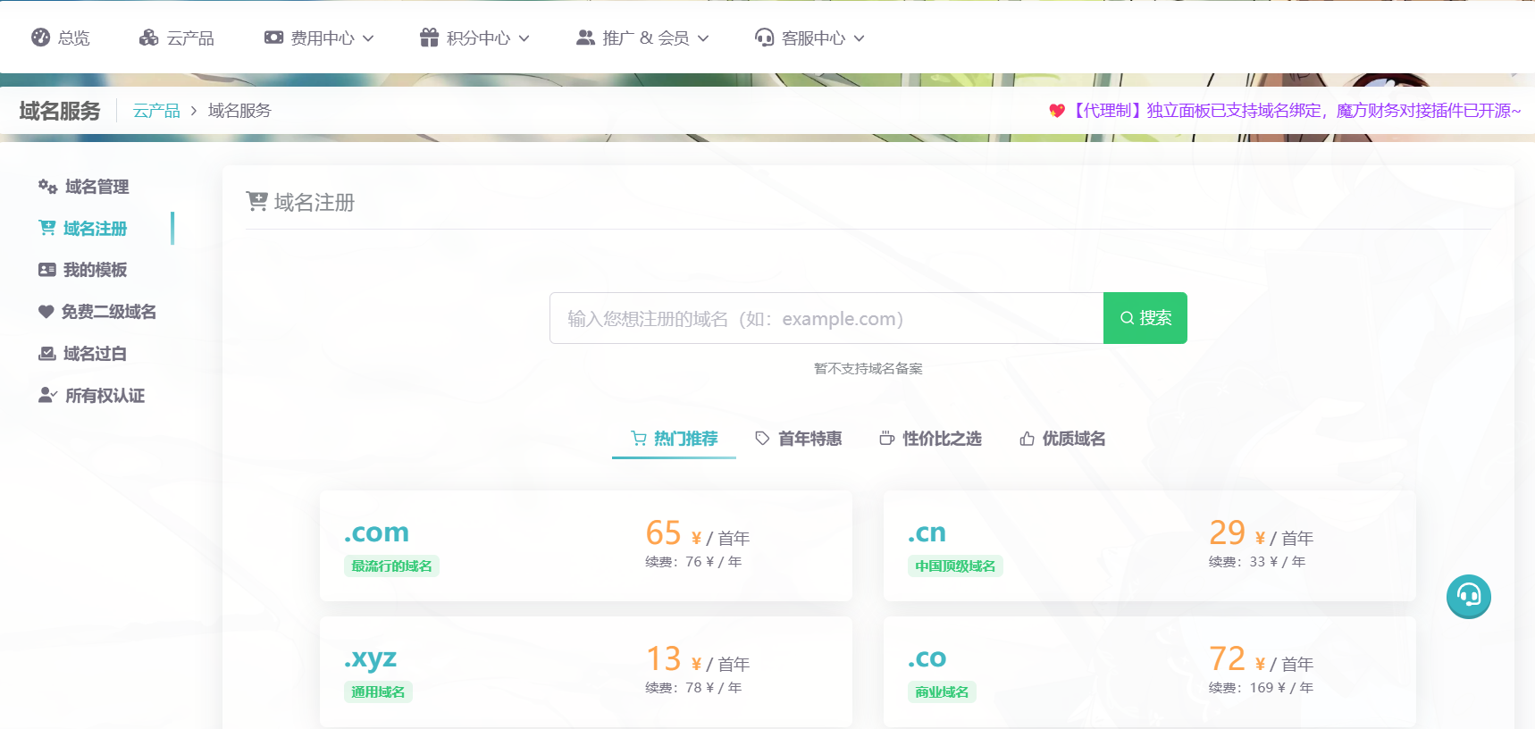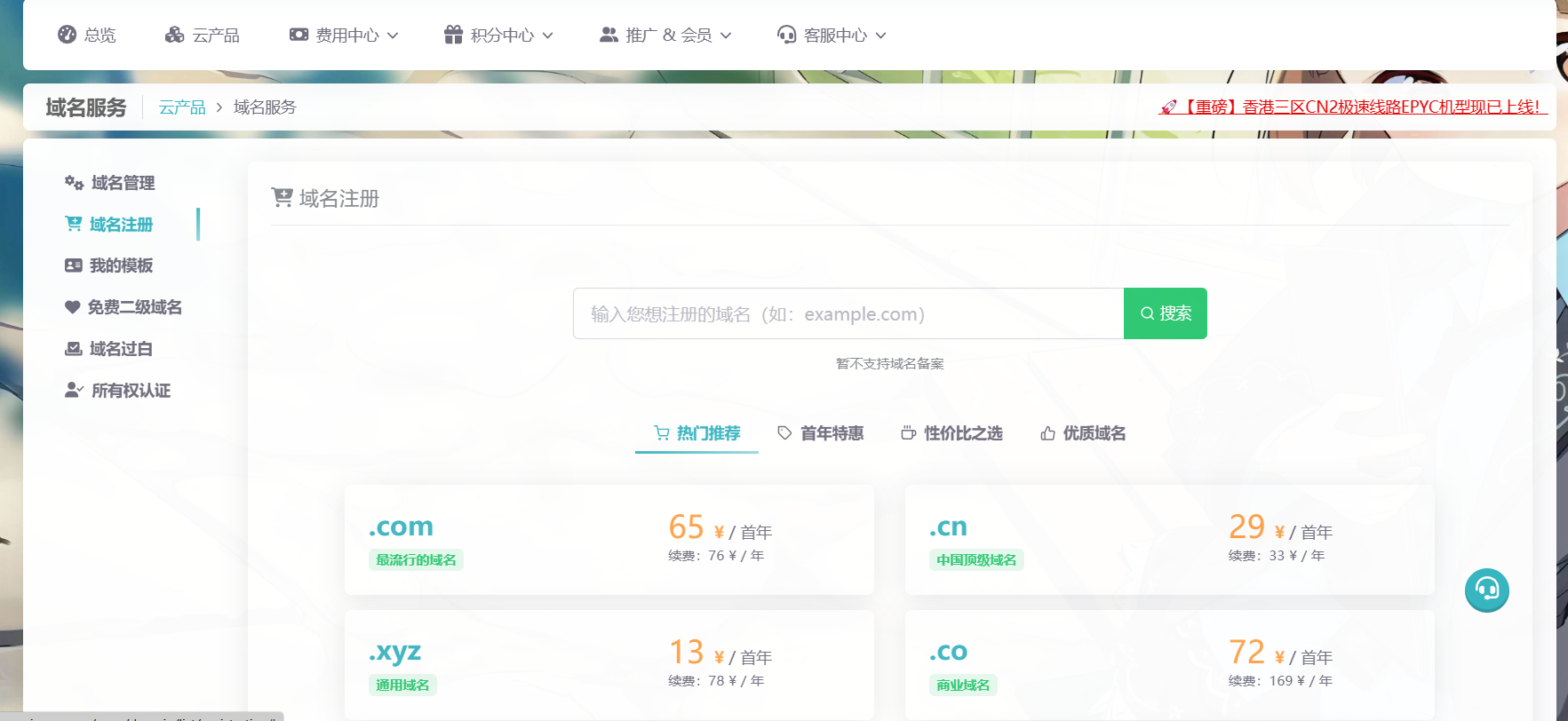 新顶级后缀如.cyou,.ink,.cloud等,首月只需要十元。.com后缀新购只需65元,续费只需要76元,远远比腾讯云、阿里云、西部数码、新网等注册商便宜!