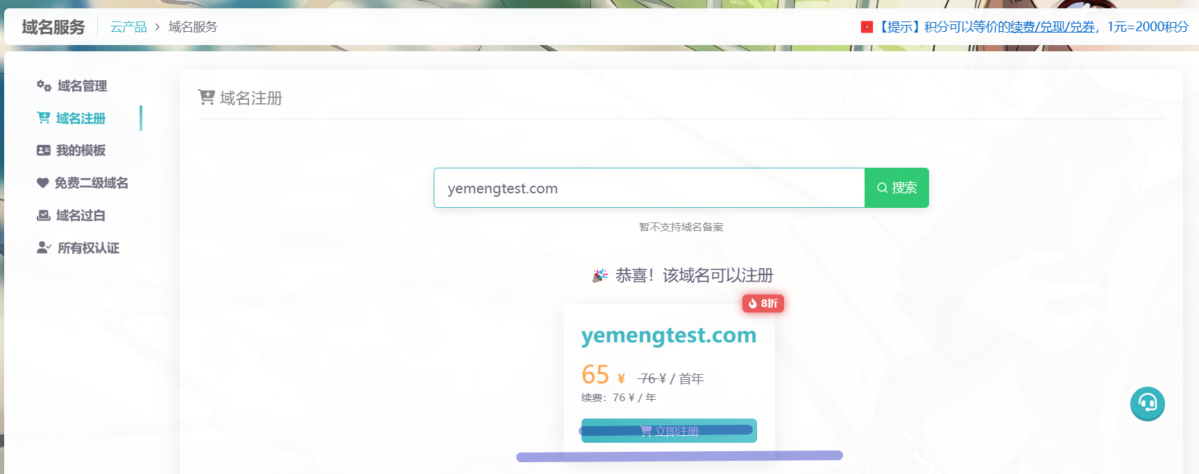 在雨云注册域名的时候,信息模板在注册时进行填写。域名注册界面:
