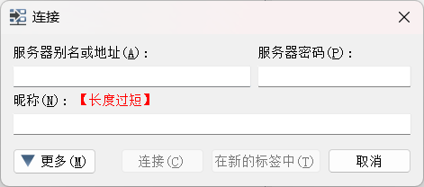 只需要填入服务器别名或者IP地址,如果有密码的话填入密码, 输入自己的昵称就可以加入了。