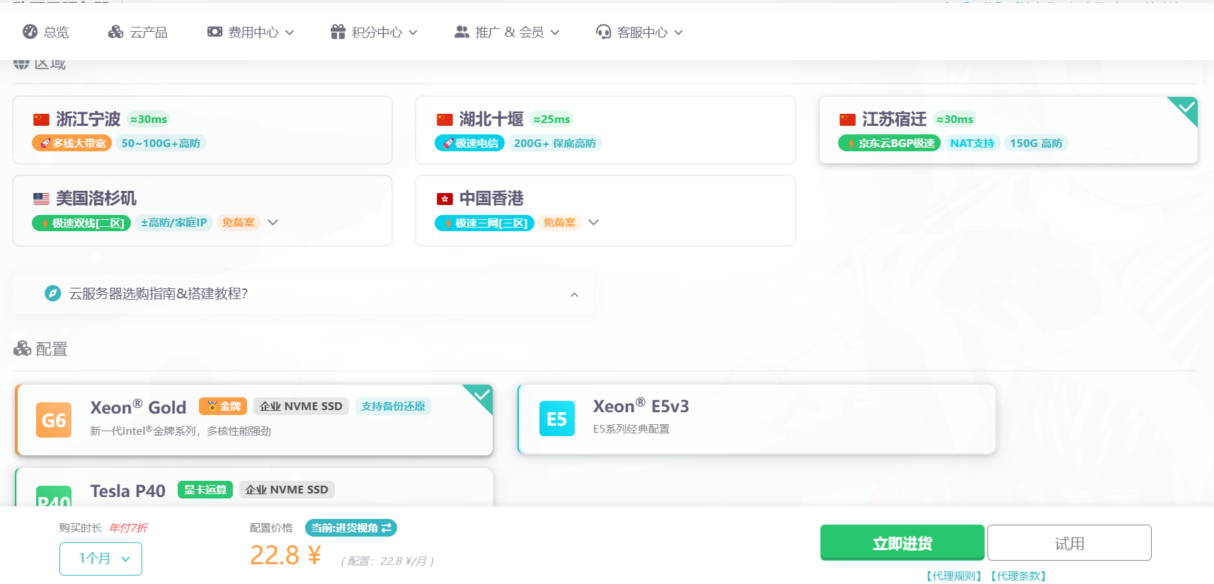 服务器地址选“江苏宿迁”,延迟较低。配置为Xeon Gold:2核心4GB内存。硬盘30GB即可,可以根据需要进行添加(上限250GB)。