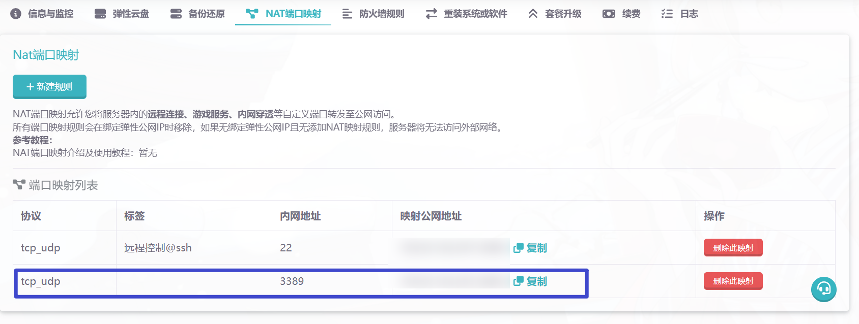 夜梦这里使用的是共享IP服务器,所以需要将3389端口映射出来,以便能够连接。映射的端口只要没有被占用任意选择就行。