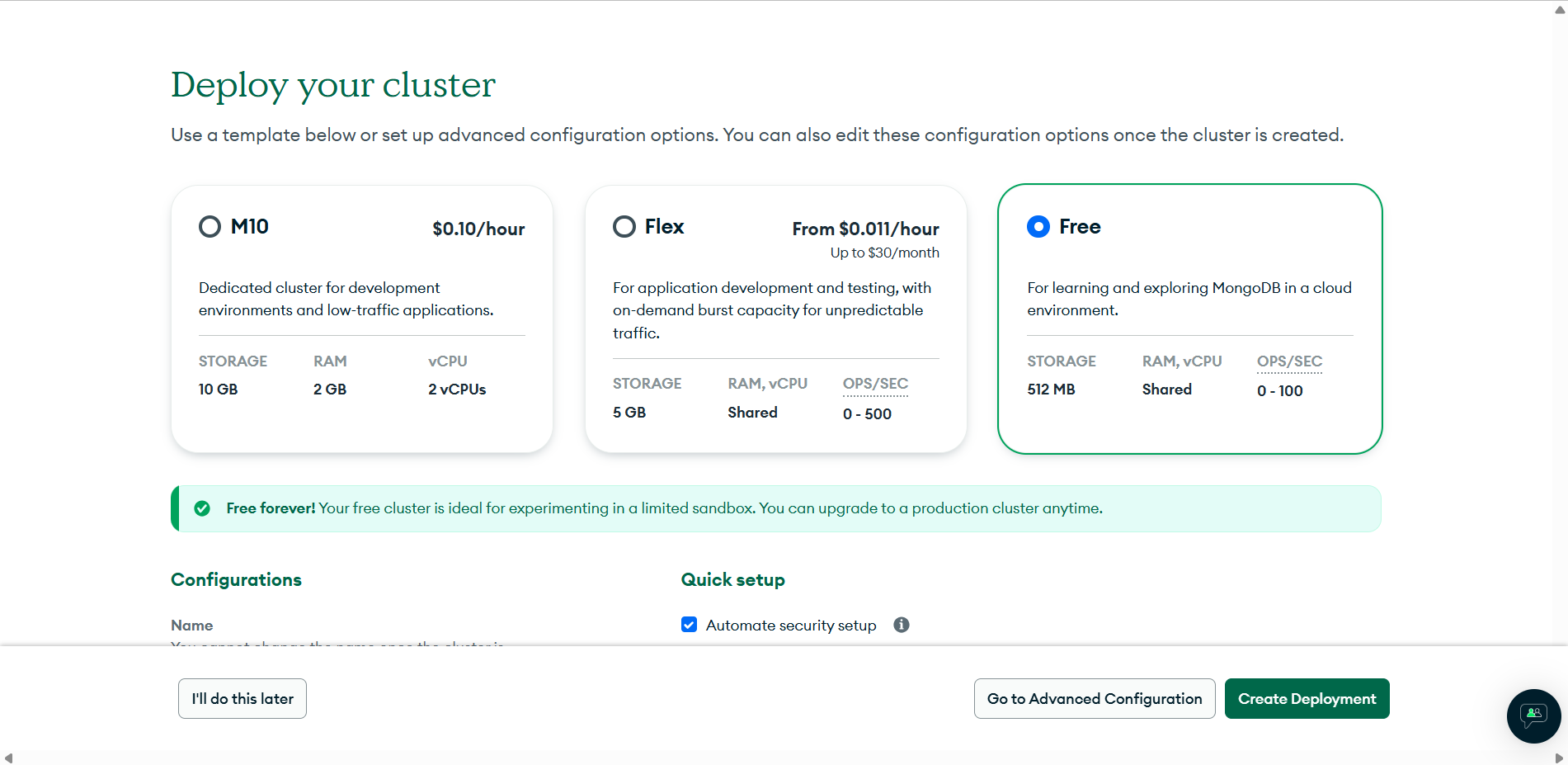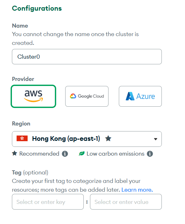 以下步骤针对新用户,在MongoDB AtLas注册完账号以后,创建免费 MongoDB 数据库。