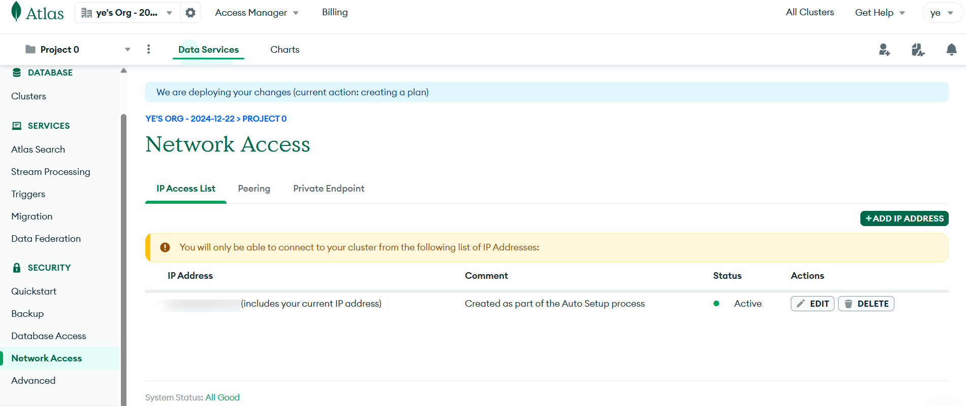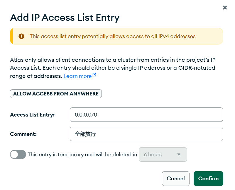 创建完用户以后,就可以close了。接下来在 Network Access 页面点击 Add IP Address 添加网络白名单。因为 Vercel 的出口地址不固定,所以我们这里 Access List Entry 输入 0.0.0.0/0(允许所有 IP 地址的连接)。