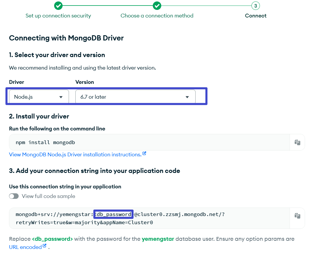 将连接字符串中的 <username>:<password> 修改为刚刚创建的数据库 用户名:密码。到这里,你得到了: