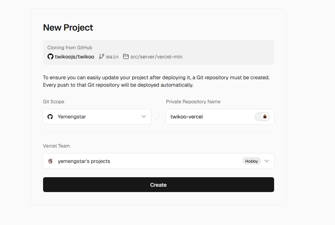 点击后面的链接将 Twikoo 一键部署到 Vercel:New Project – Vercel