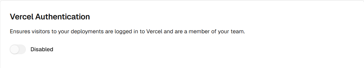 添加完毕点击save,然后进入 Settings – Deployment Protection,设置 Vercel Authentication 为 Disabled,并 Save。